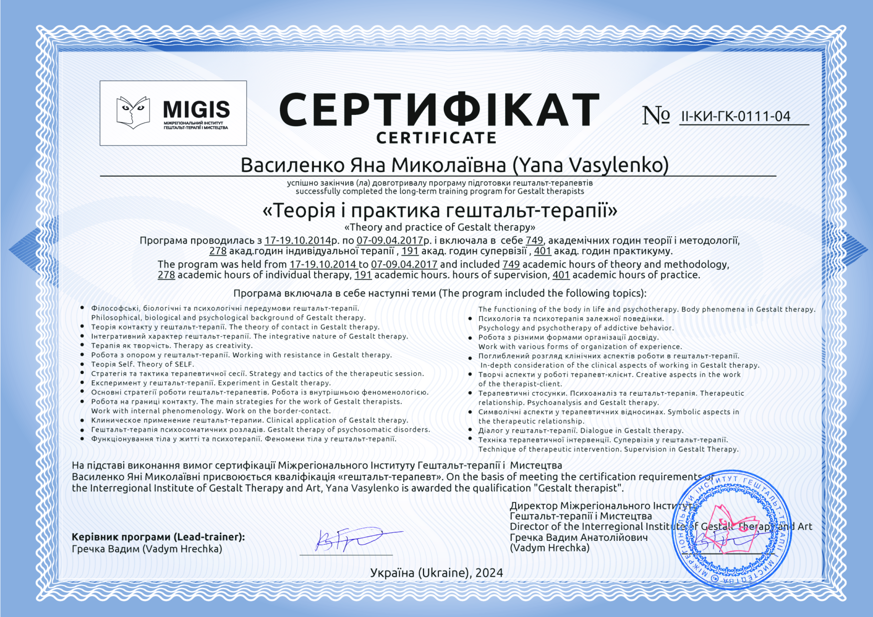 3.3. Виконавець є сертифікованим Тренером Міжрегіонального інституту гештальт-терапії та мистецтва (MIGIS), який діє на підставі Договору підприємницького франчайзингу (комерційної концесії), за умовами якого правомірно надає послуги з використанням знаку для товарів і послуг MIGIS, а Замовник – має право на отримання відповідного Сертифікату MIGIS за наслідками успішного засвоєння Програми Курсу. Наявність інформації про Виконавця на веб-порталі MIGIS є достатнім підтвердженням приналежності Виконавця та Тренерів до Спільноти та правомірності надання останніми Послуг.