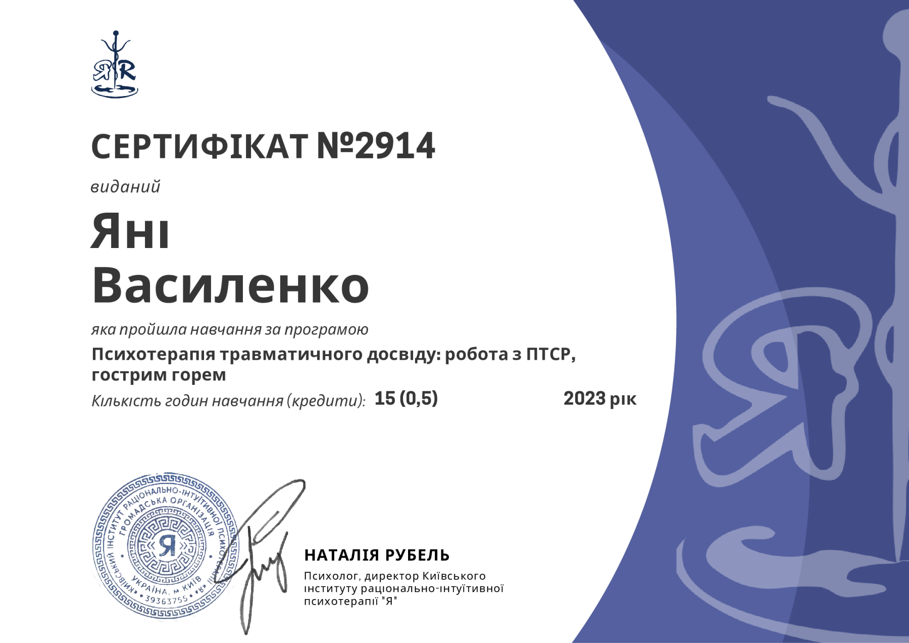 2023 р. – Київський інститут раціонально-інтуітивної психотерапії "Я" Програма "Психотерапія травматичного досвіду: робота з ПТСР, гострим болем", під керівництвом Рубель Н. Сертифікат № 2914.