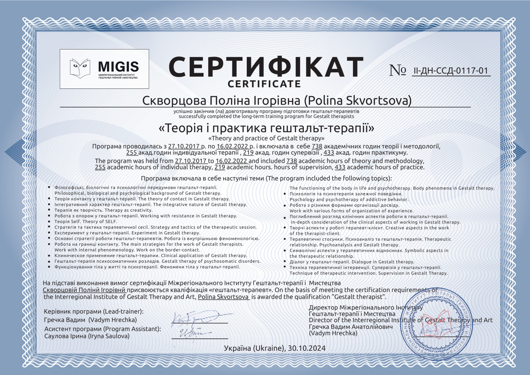 2017 - 2022 гг. - Межрегиональный институт гештальт-терапии и искусства (MIGIS), «Теория и практика гештальт-терапии», (ІІ ступень). Программа под руководством Гречки В. Сертификат №II-ДН-ССД-0117-01.