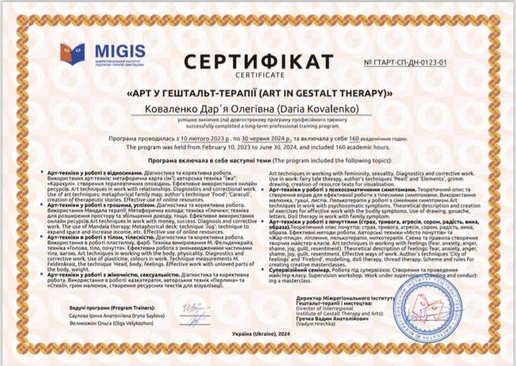 2023 – 2024 рр. – Міжрегіональний інститут гештальт-терапії та мистецтва (MIGIS), спеціалізована програма «Арт техніки в гештальт-терапії». Програма під керівництвом Велікожон О. та Сауловоі І. Сертифікат №ГТАРТ-СП-ДН-0123-01.