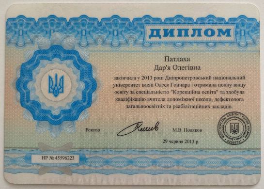 2008 – 2013 рр. – Дніпровський національний університет імені Олеся Гончара, спеціальність корекційна освіта. Диплом НР № 45596223.