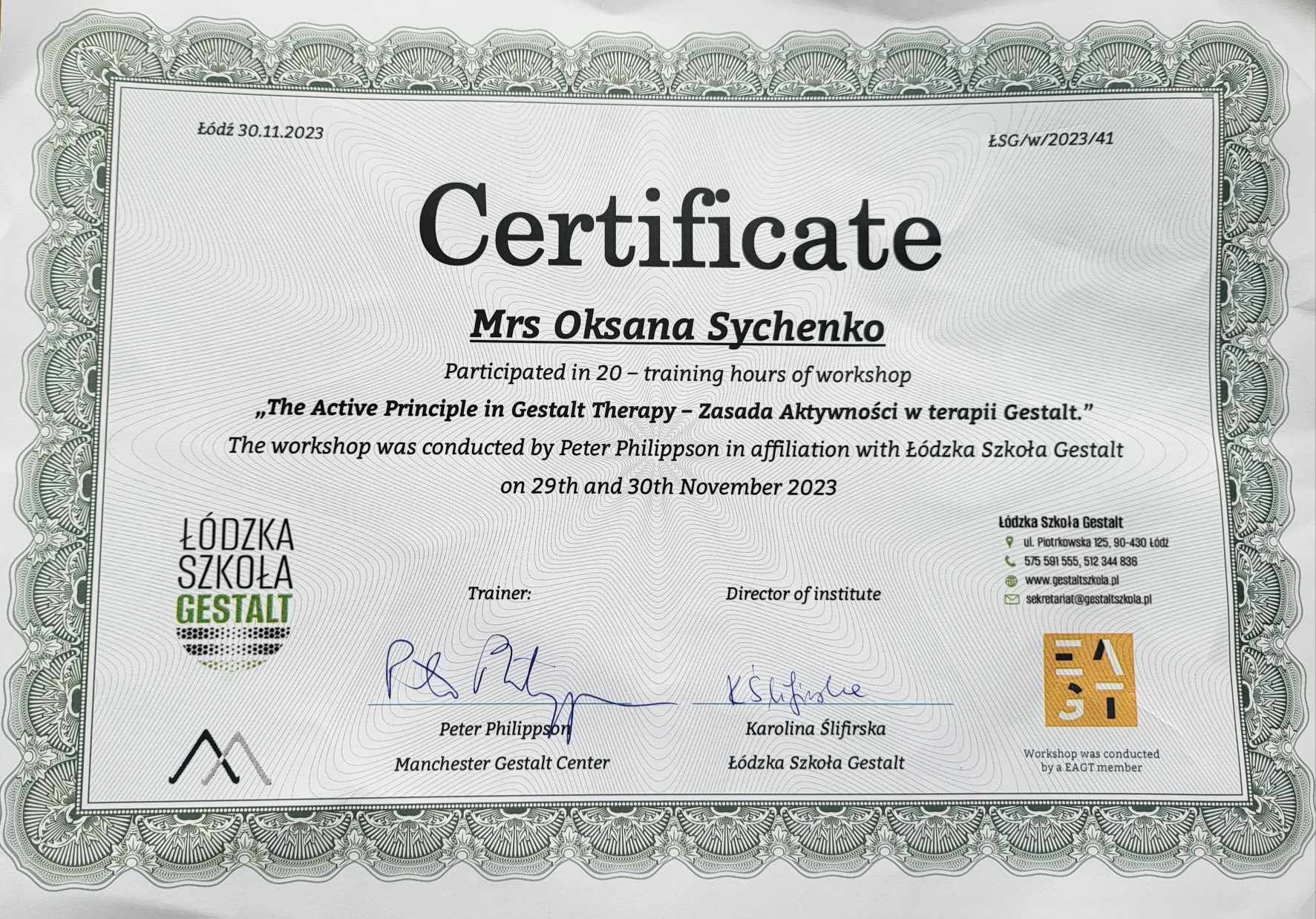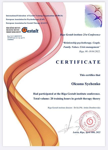 2010 – 2014 – Interregional Institute of Gestalt Therapy and Art (MIGIS) “Theory and Practice of Gestalt Therapy” (1, 2 Stages). Program led by Hrechka V., Savitskaya T. Certificate II-ДН-0110-3.