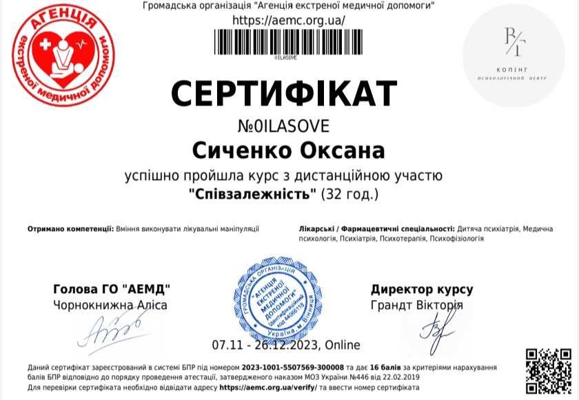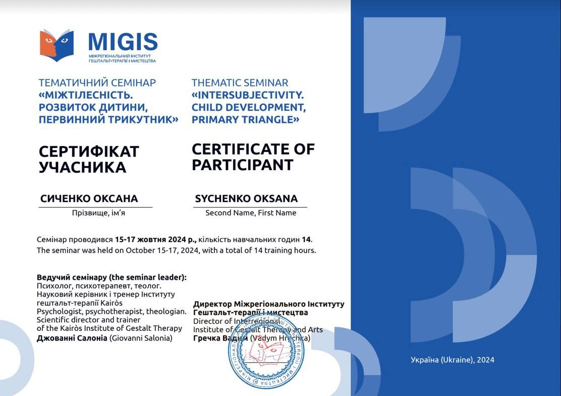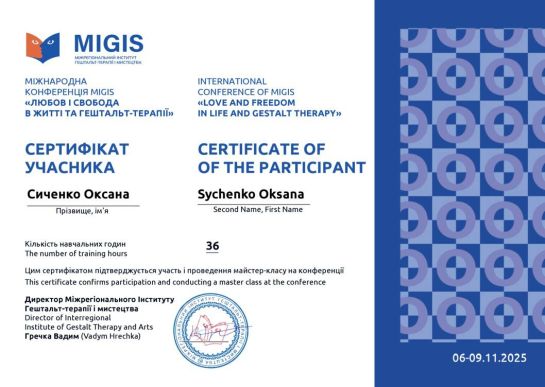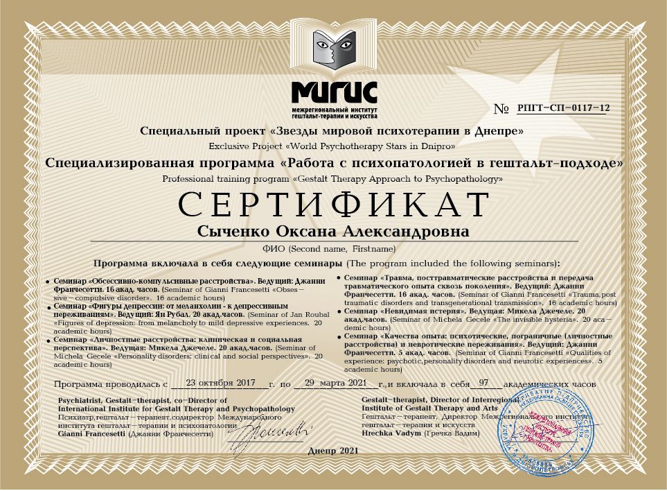 2012 – 2013 – Interregional Institute of Gestalt Therapy and Art (MIGIS), "Integrative Group Psychotherapy". Program led by Hrechka V. Certificate № ИГТ-ДН-0112-10.