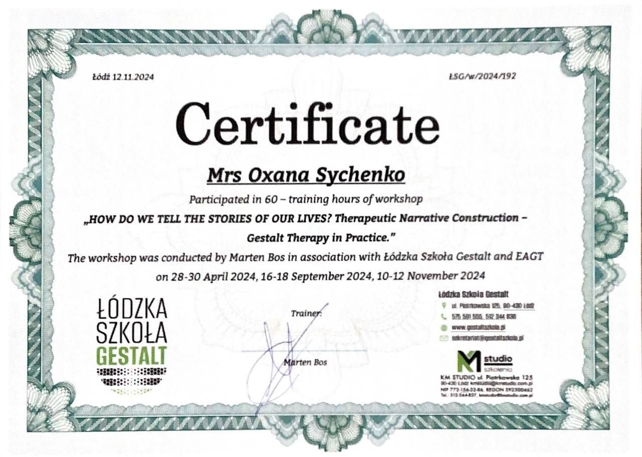 28-30.04.2024, 17-18.09.2024, 10-12.11.2024р. - Lodz Gestalt School, workshop “How do we tell the stories of our lives? Therapeutic construction of narrative - Gestalt therapy in practice”. Program led by M. Bos. №LSG/w/2024/192