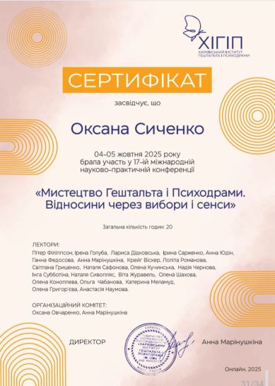 04-05.10.2025 - Kharkiv Institute of Gestalt and Psychodrama, international practical-scientific conference “The Art of Gestalt and Psychodrama. Relationships through choices and meanings.”