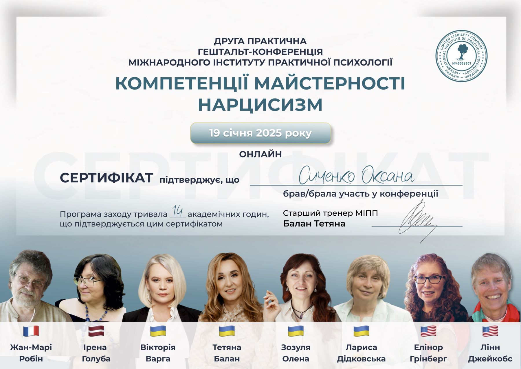 19.01.2025 - Міжнародний інститут практичної психології, гештальт-конференція "Компетенції Майстерності Нарцисизм"