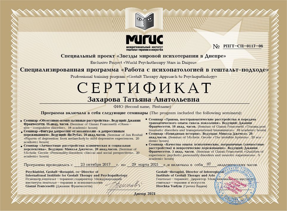 2005 - 2006 – Moscow Institute of Gestalt Therapy and Counseling (MIGTIK). Gestalt approach in working with children and parents. Program led by Zakharyan I. Certificate № ГТД-ДН/ 1-14.